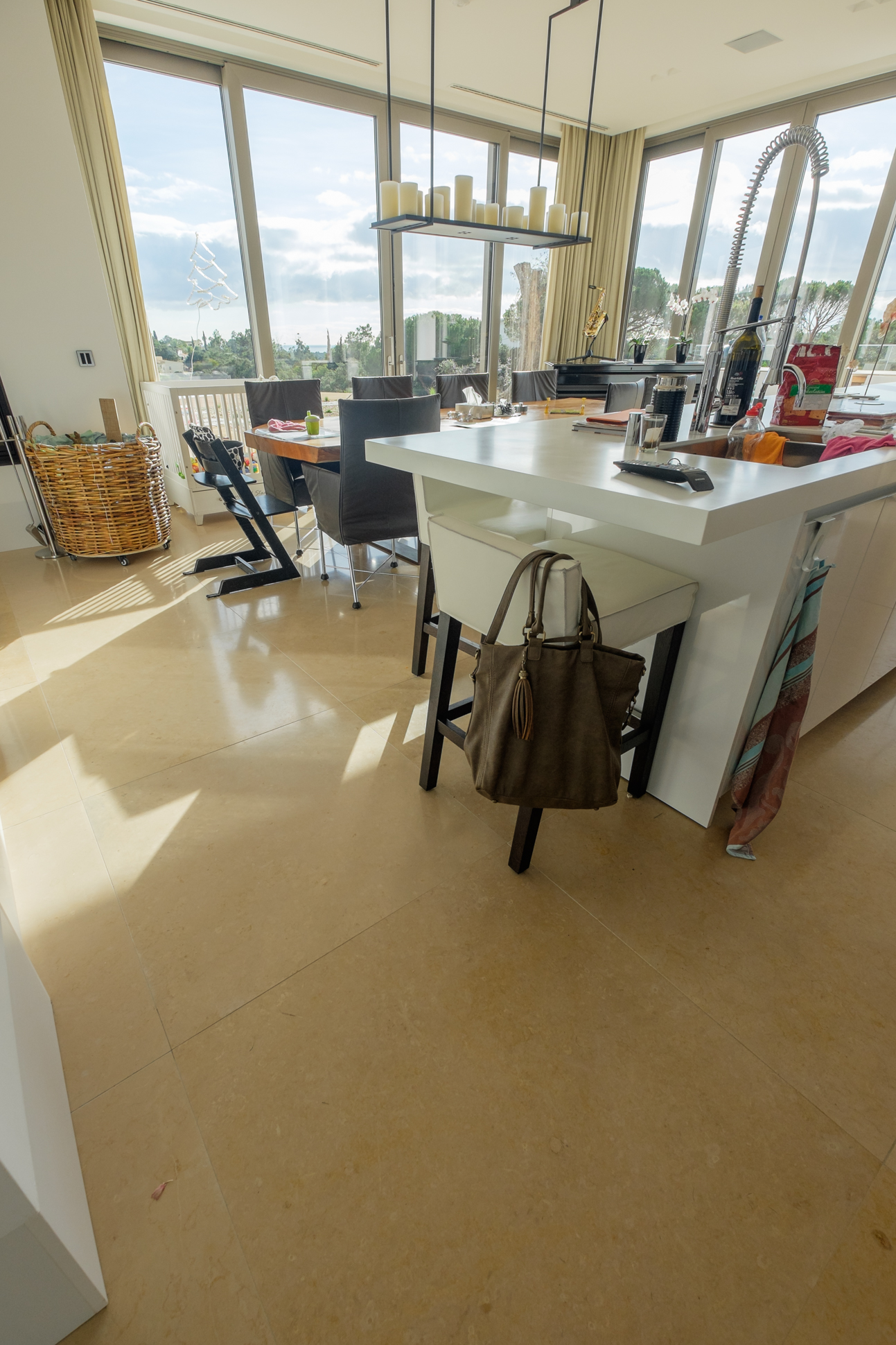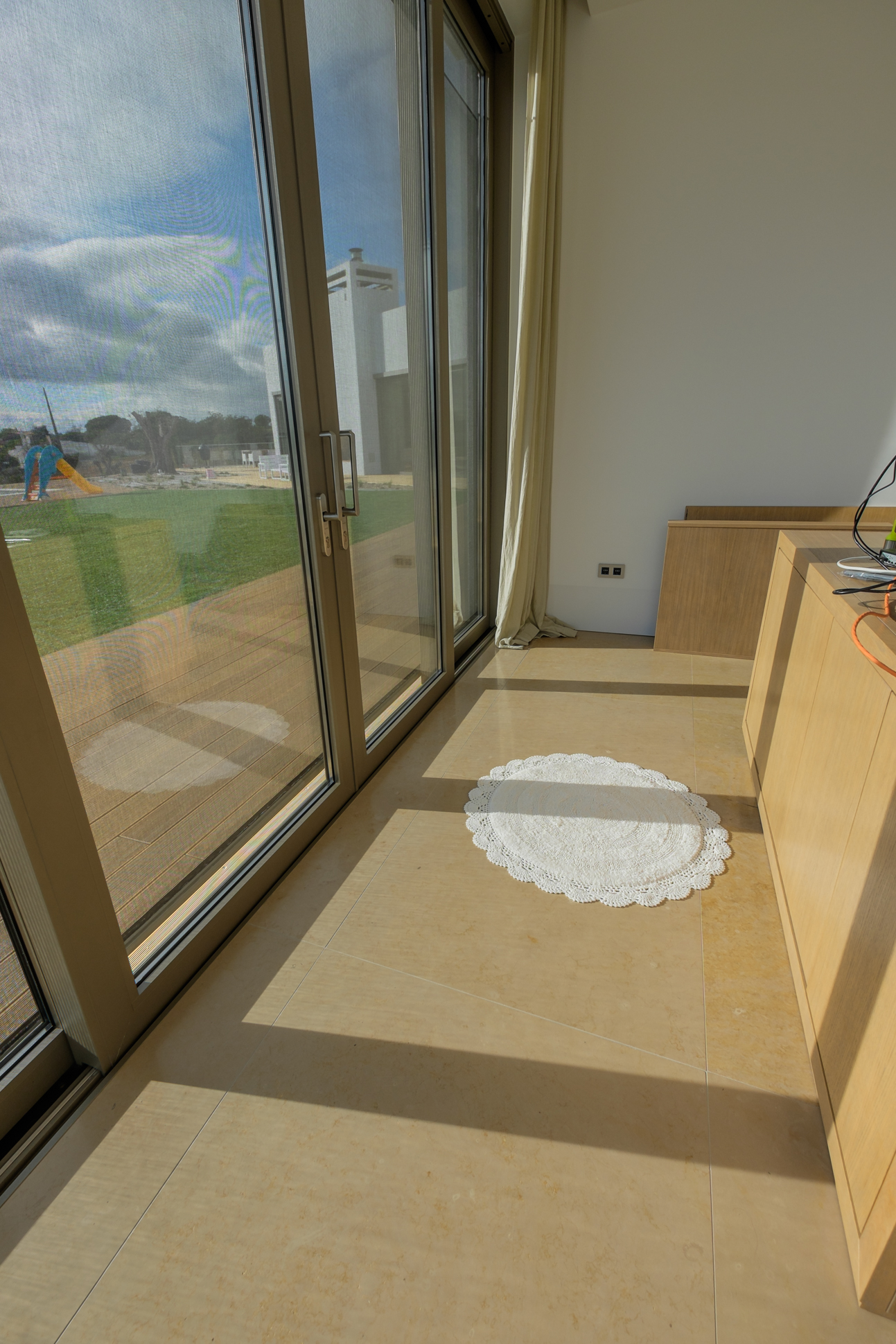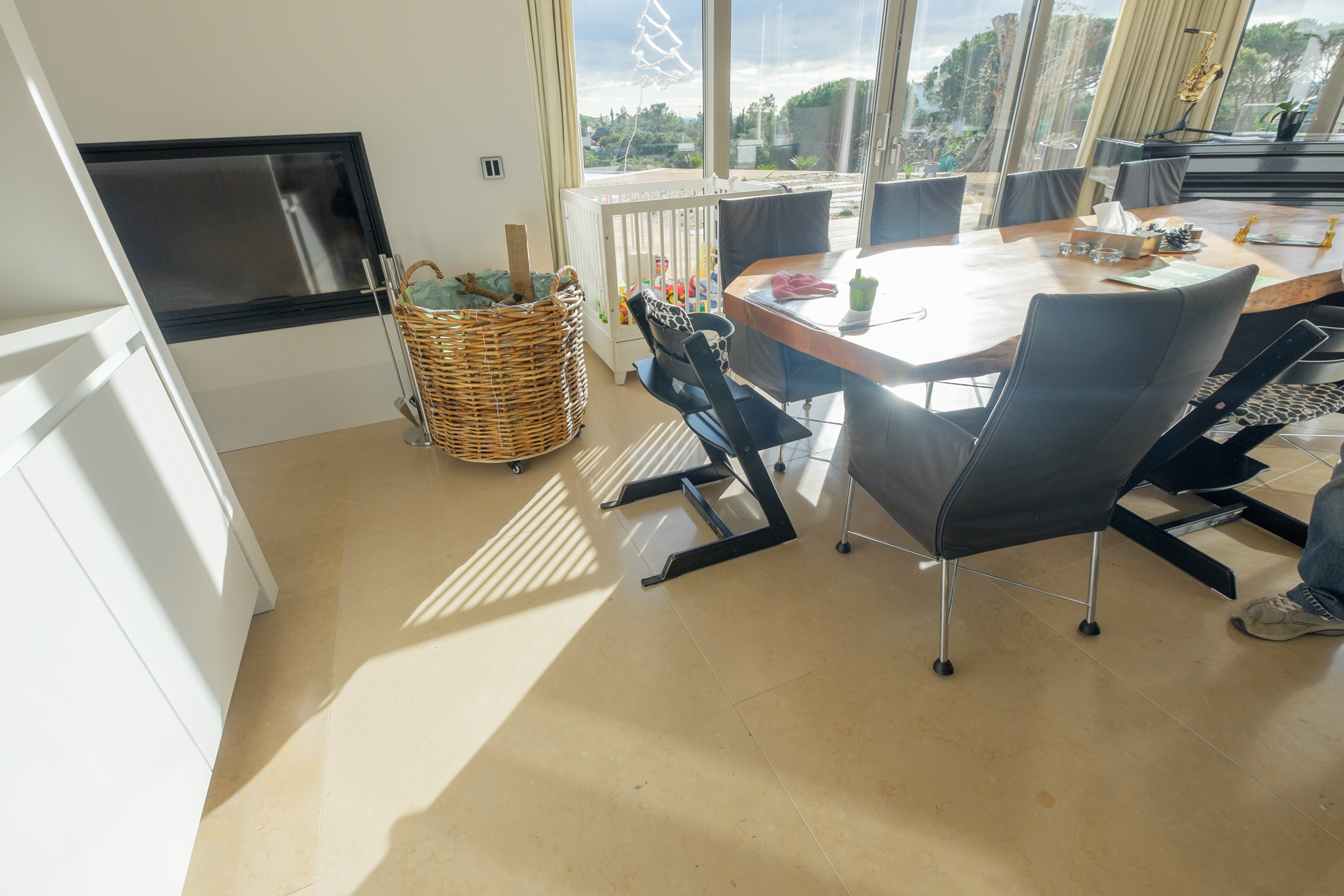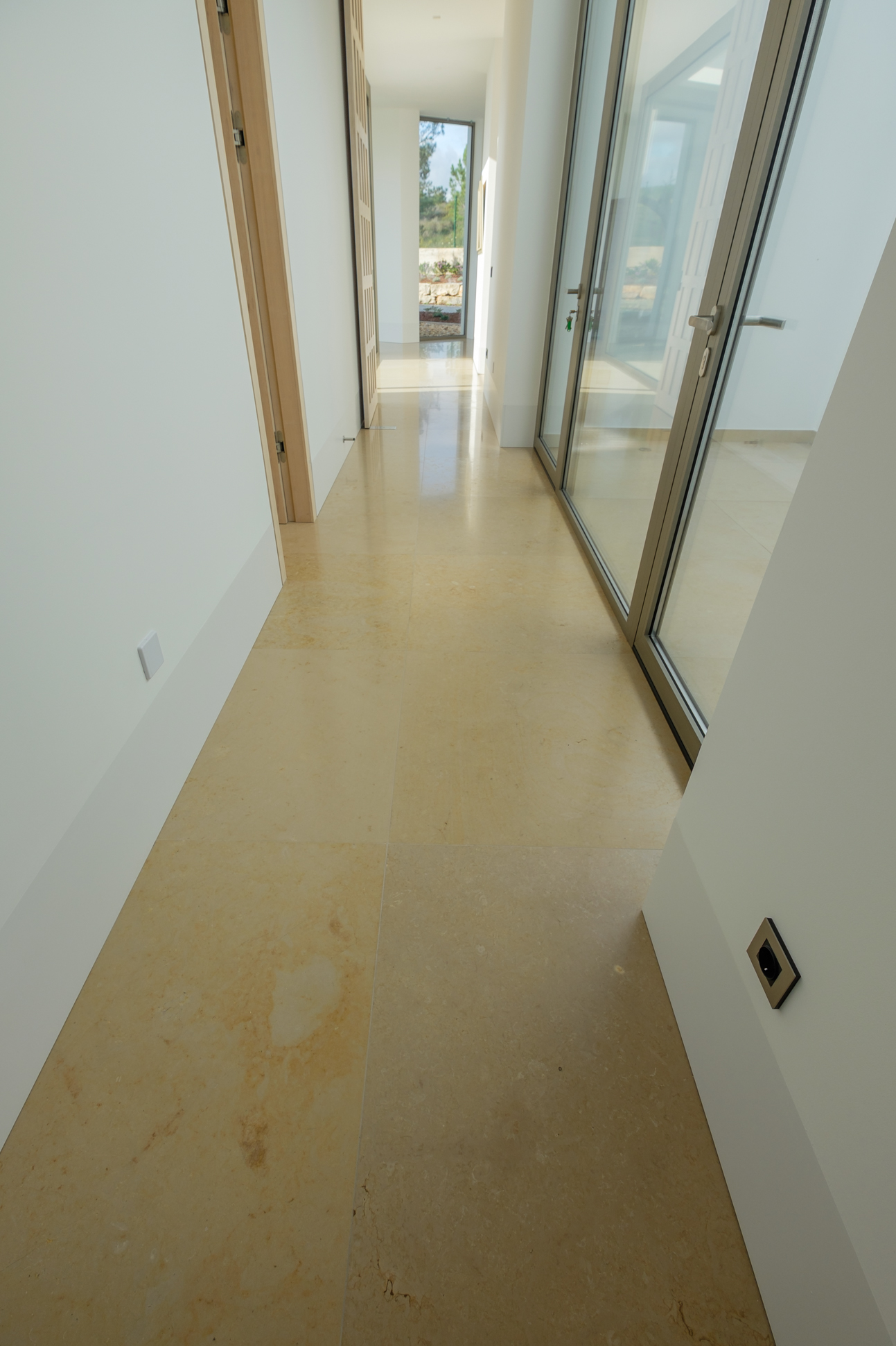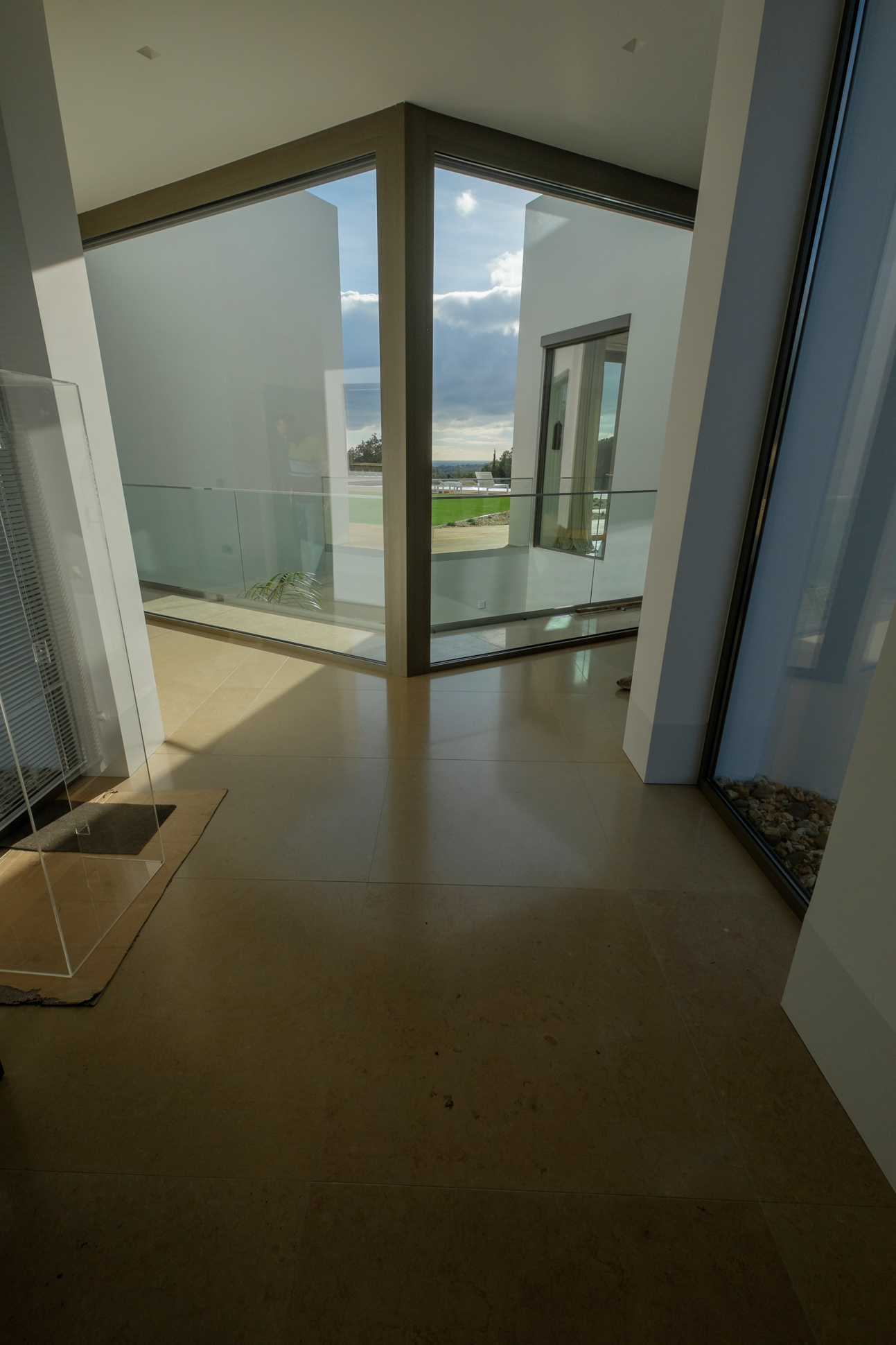 Ataija Coffee: um Ataija Crememais escuro, calcário de elevada rigidez. Pavimento com ladrilhos na medida 900x900x20mm acabamento Amaciado, obra no Algarve.
