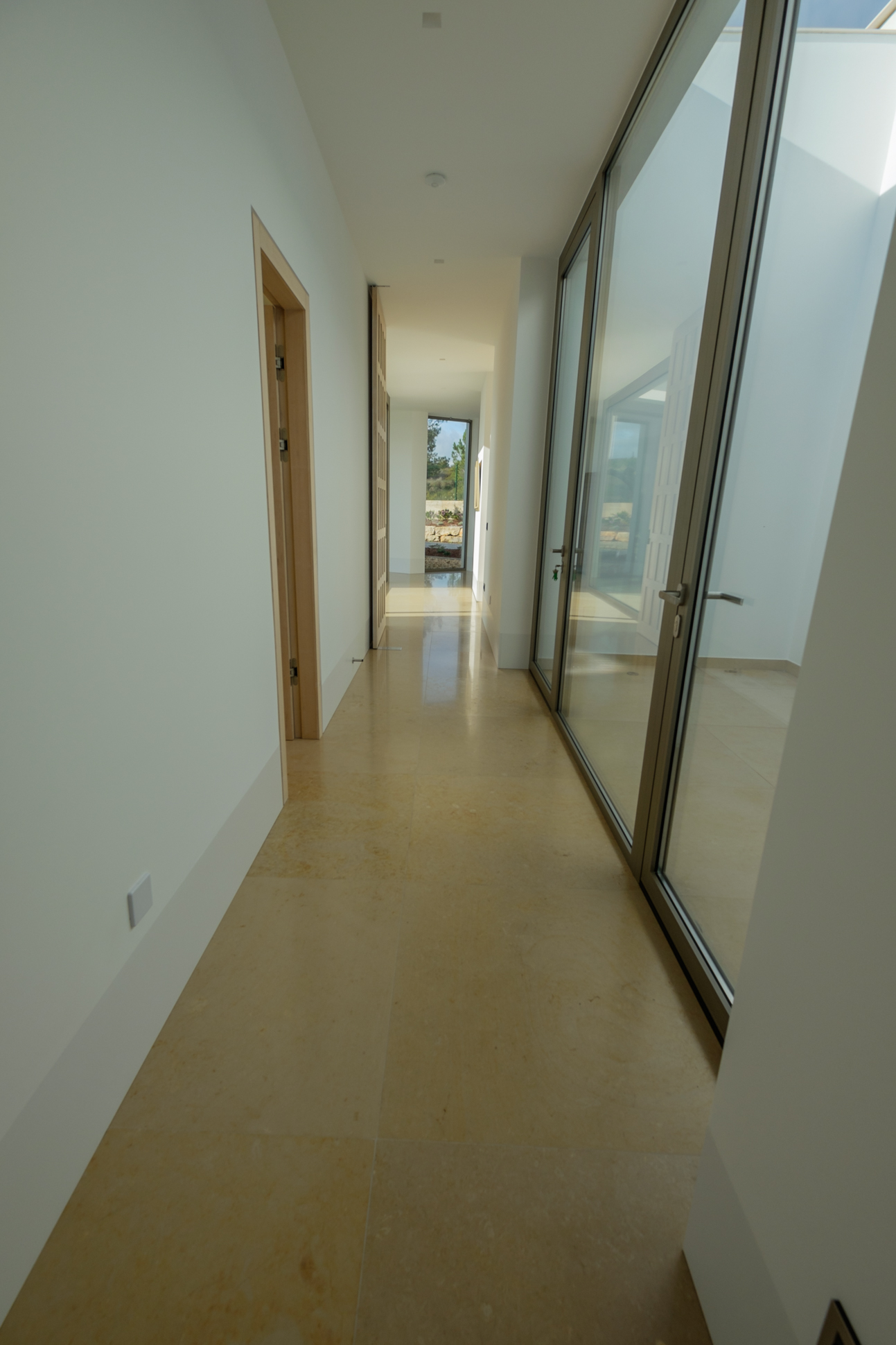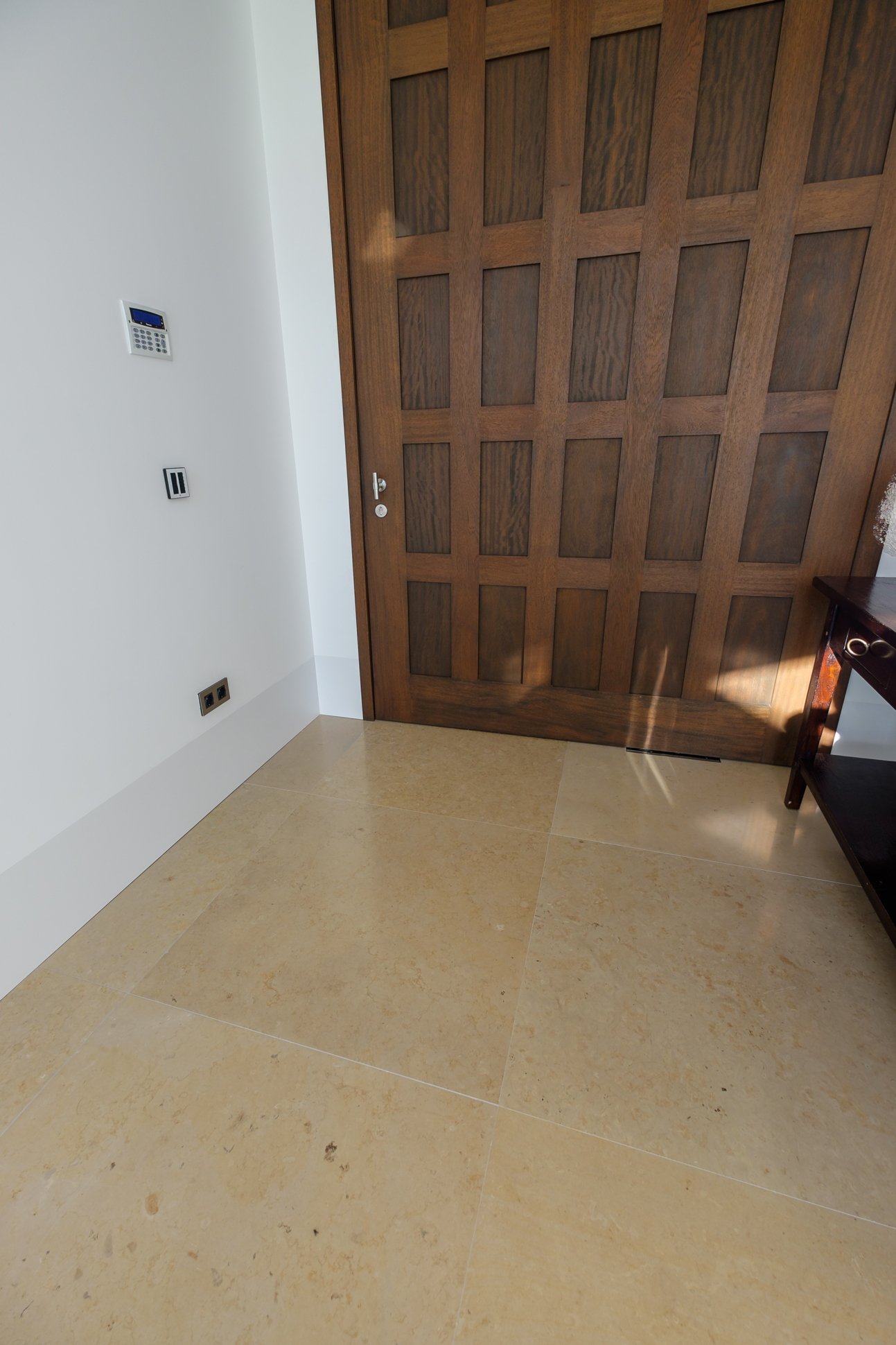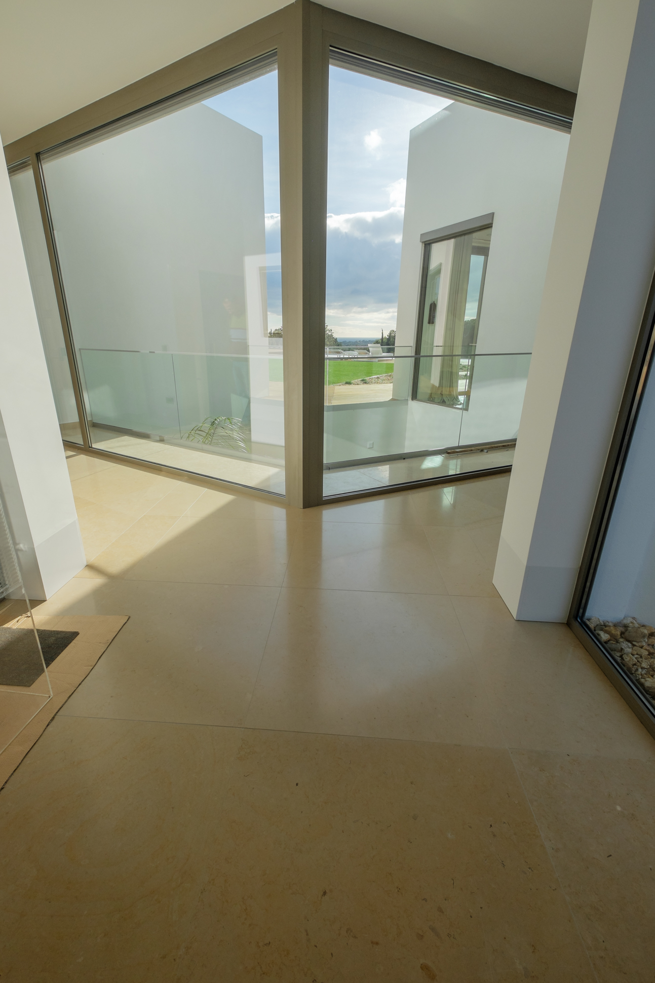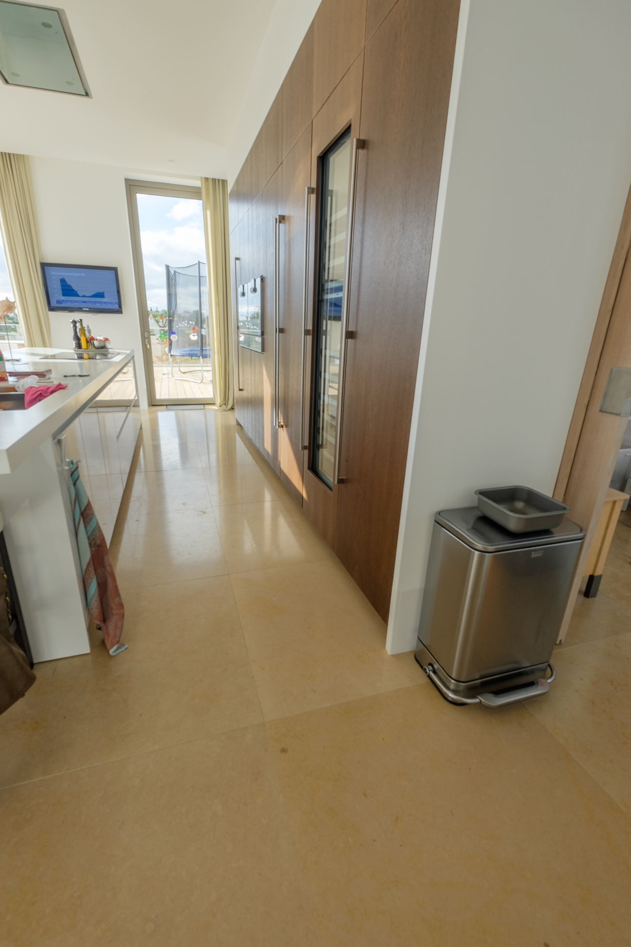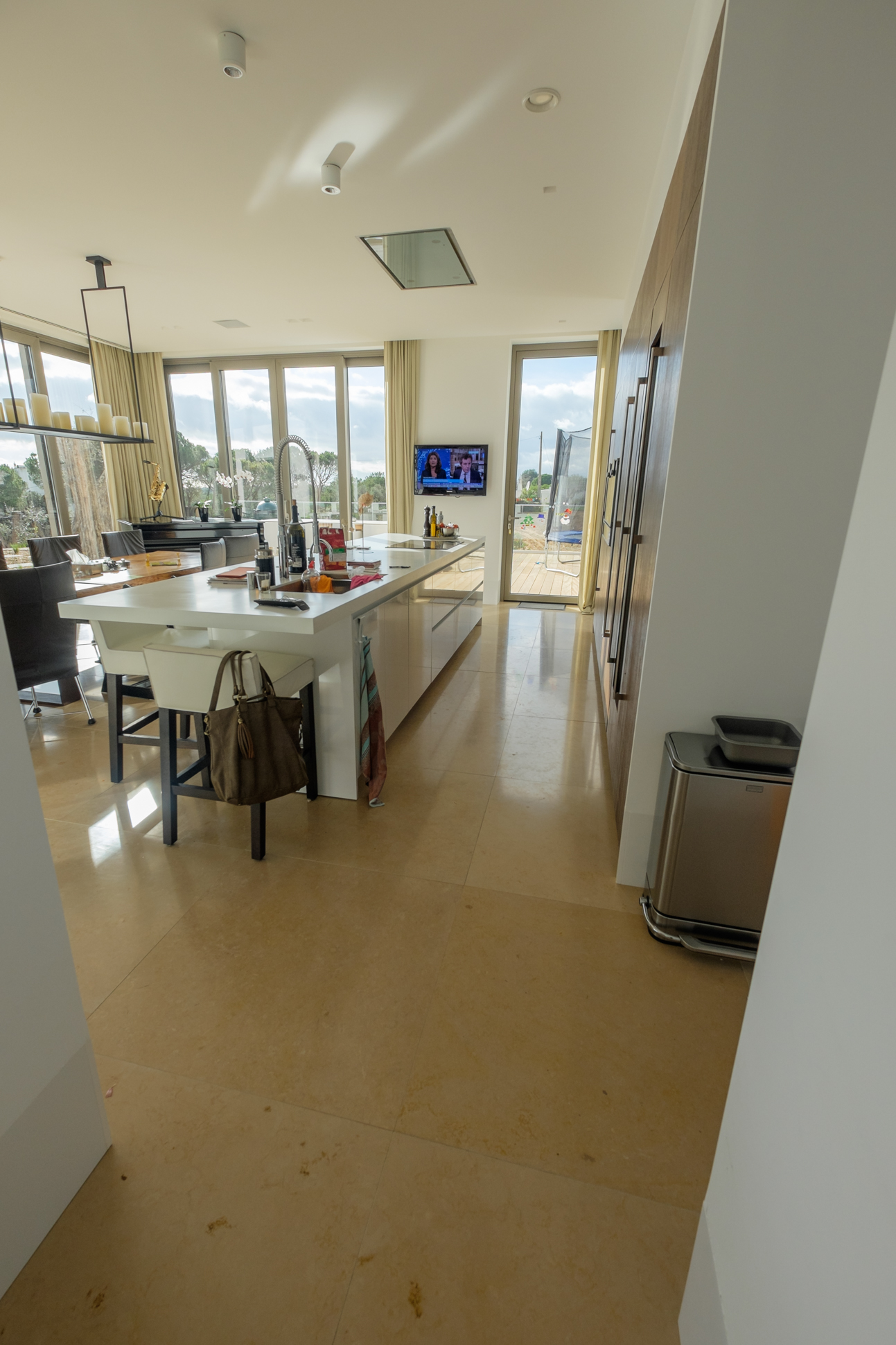 Ataija Coffee: um Ataija Crememais escuro, calcário de elevada rigidez. Pavimento com ladrilhos na medida 900x900x20mm acabamento Amaciado, obra no Algarve.