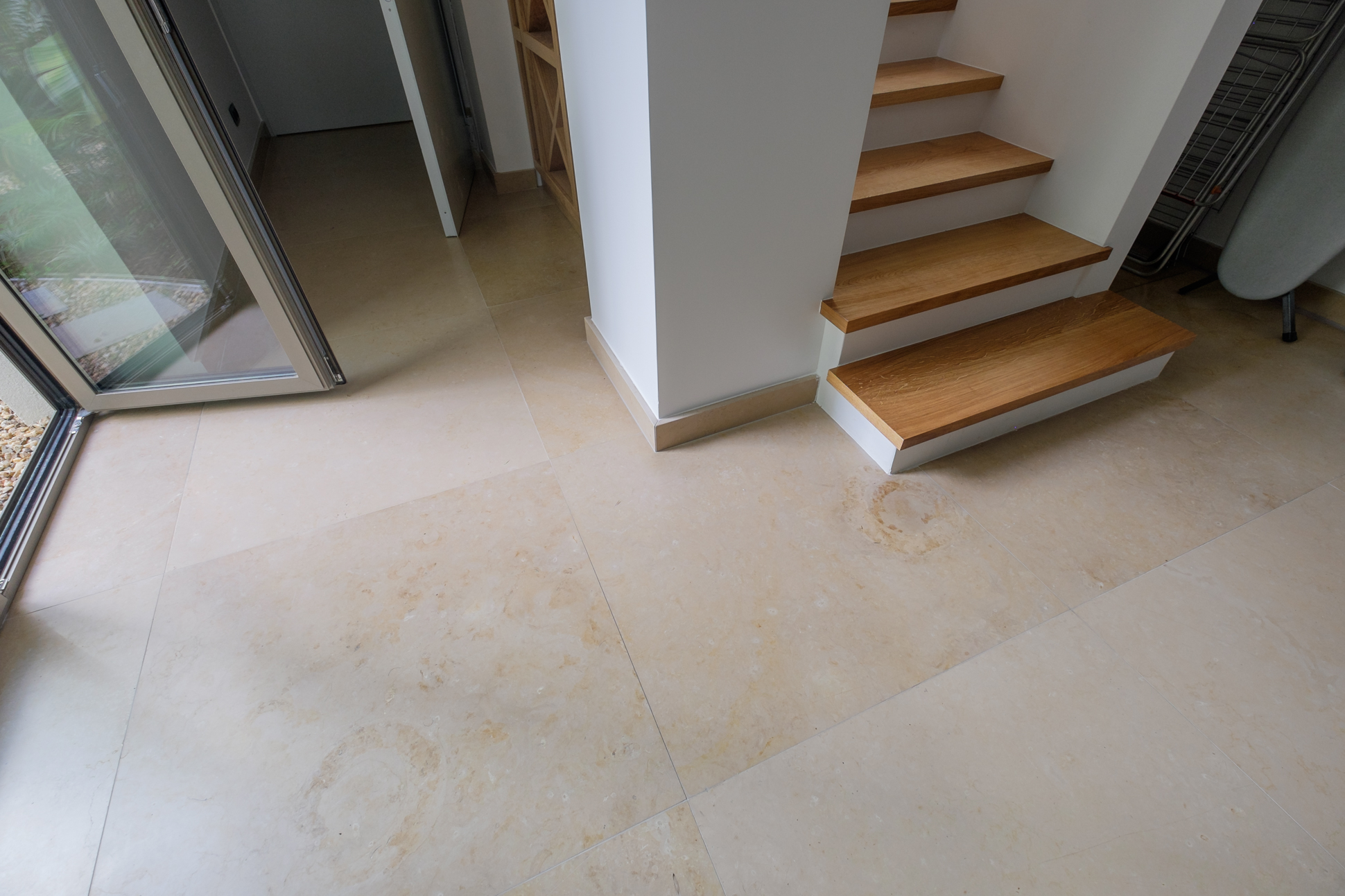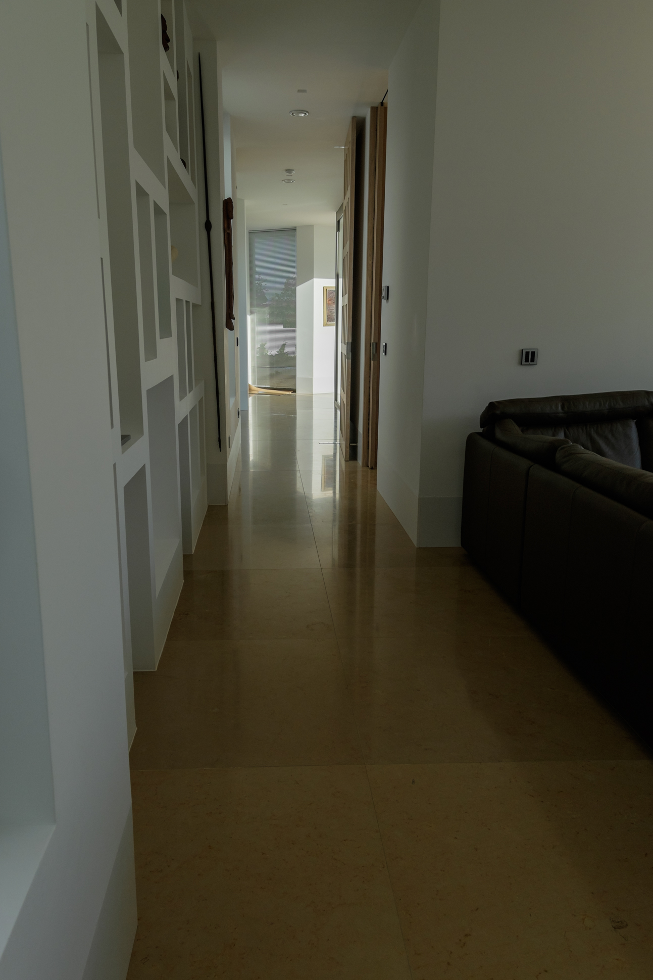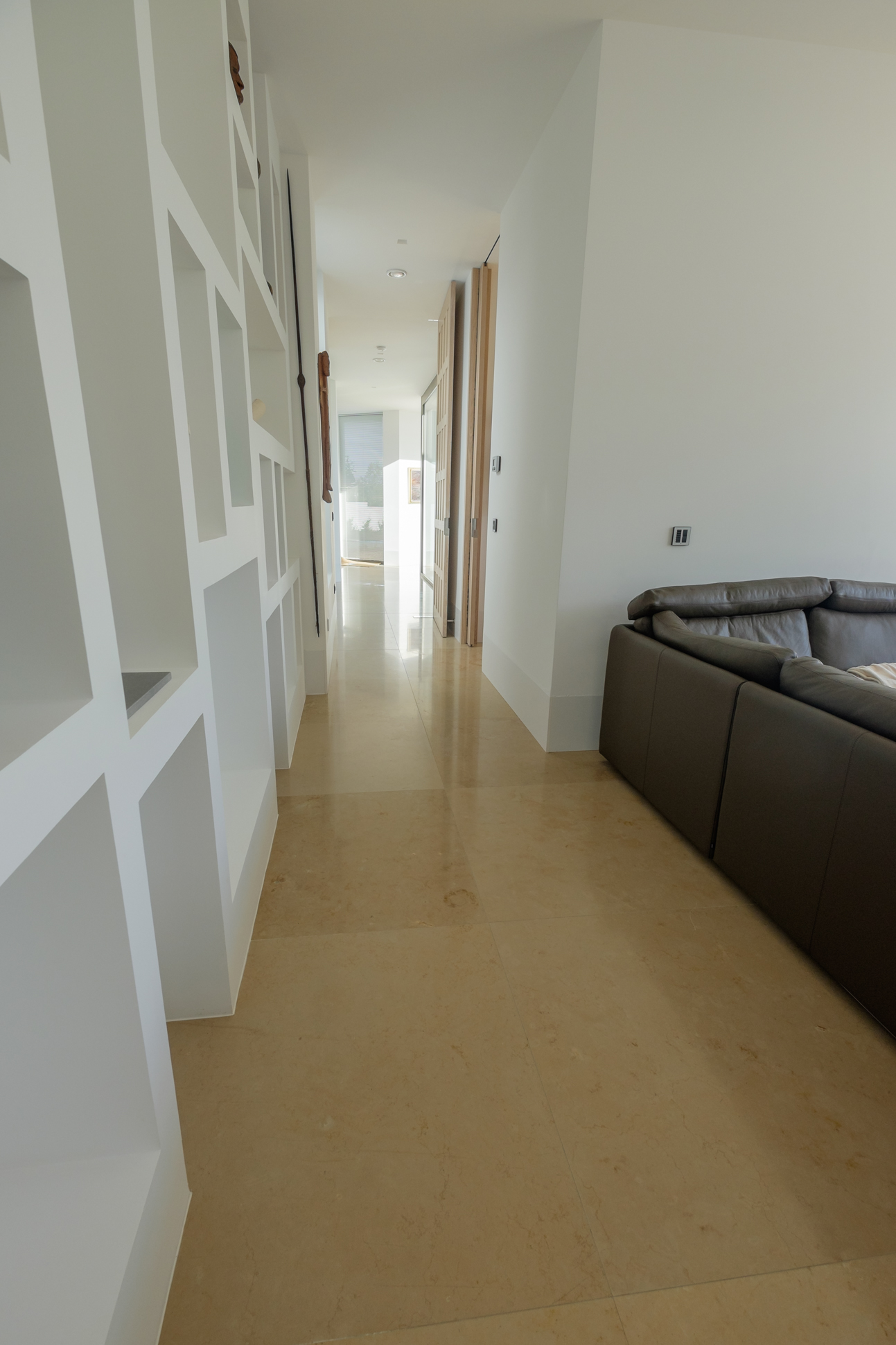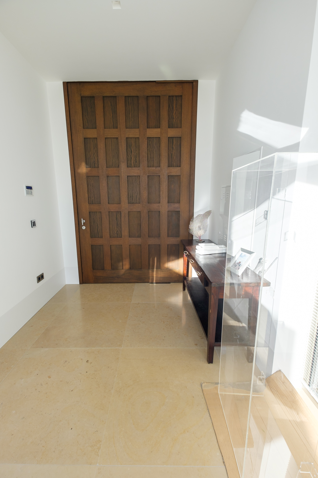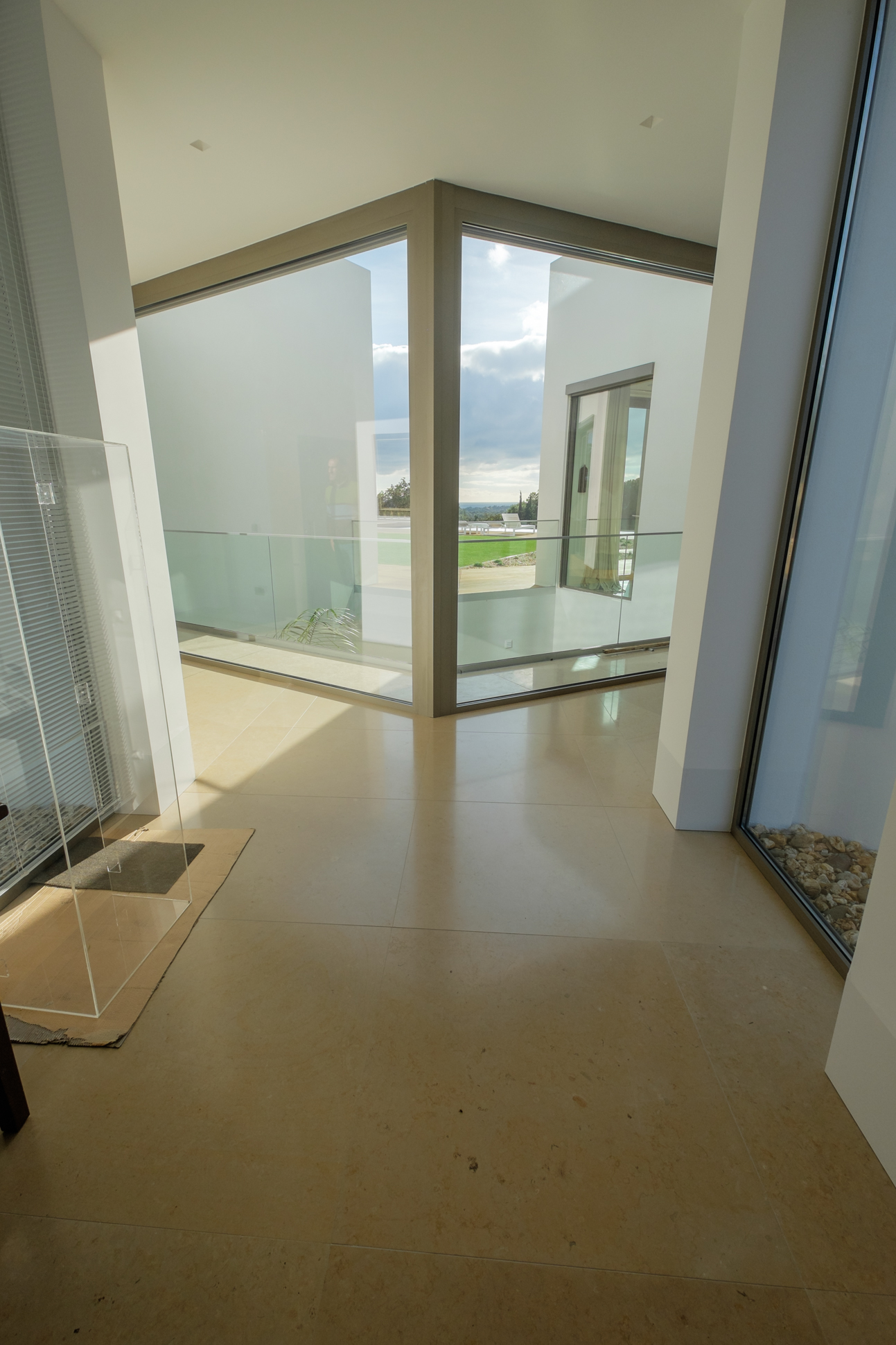Ataija Coffee: um Ataija Crememais escuro, calcário de elevada rigidez. Pavimento com ladrilhos na medida 900x900x20mm acabamento Amaciado, obra no Algarve.