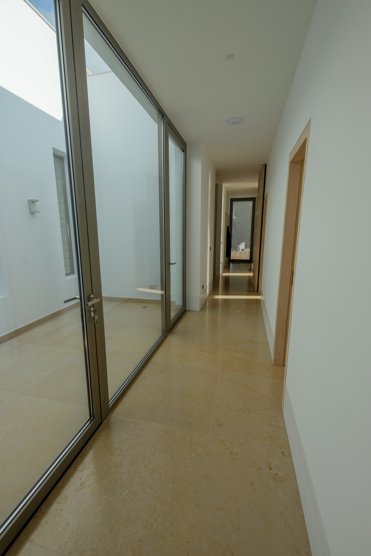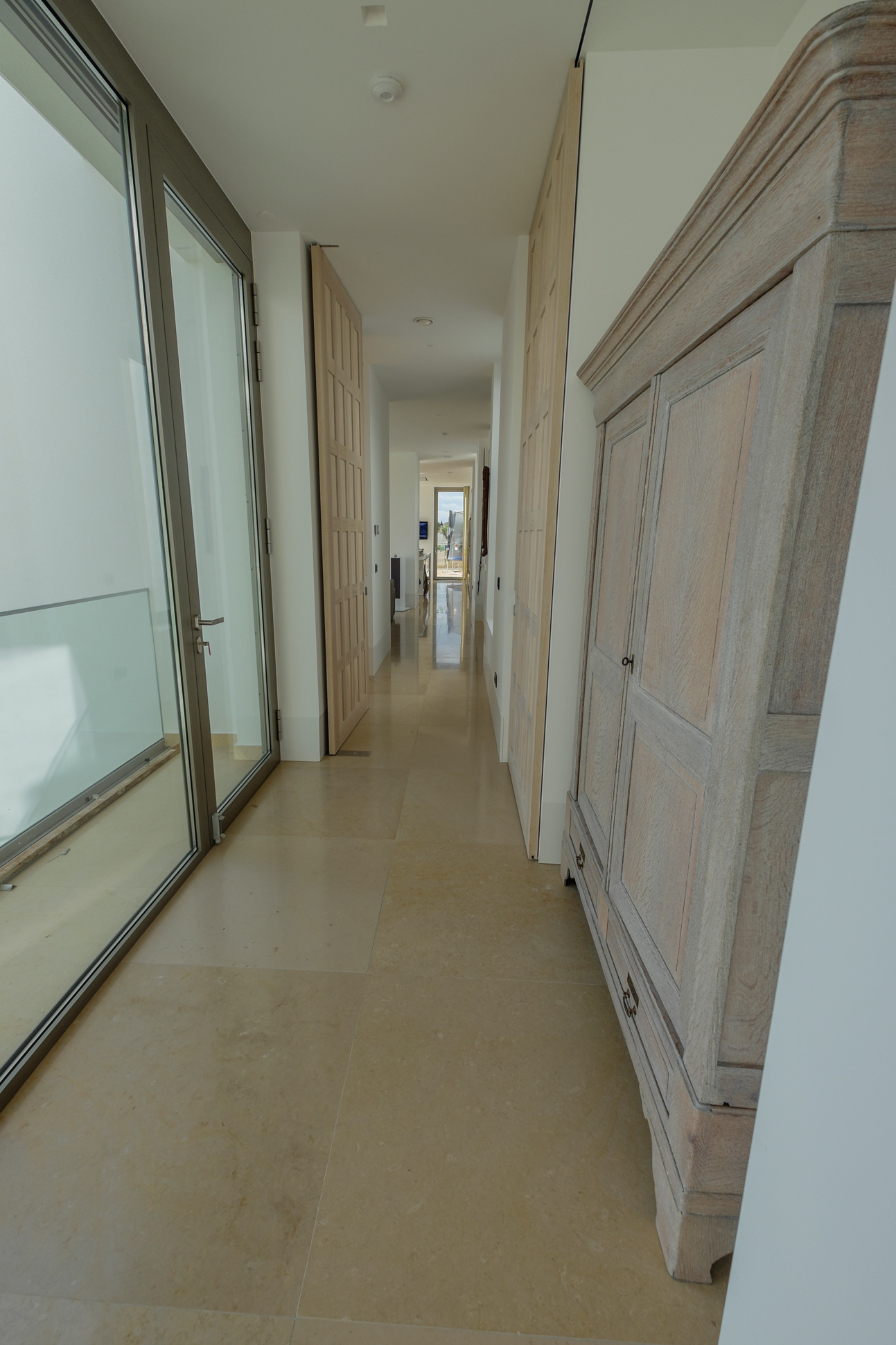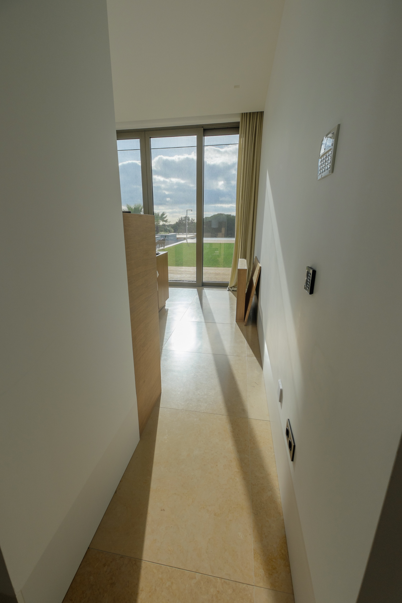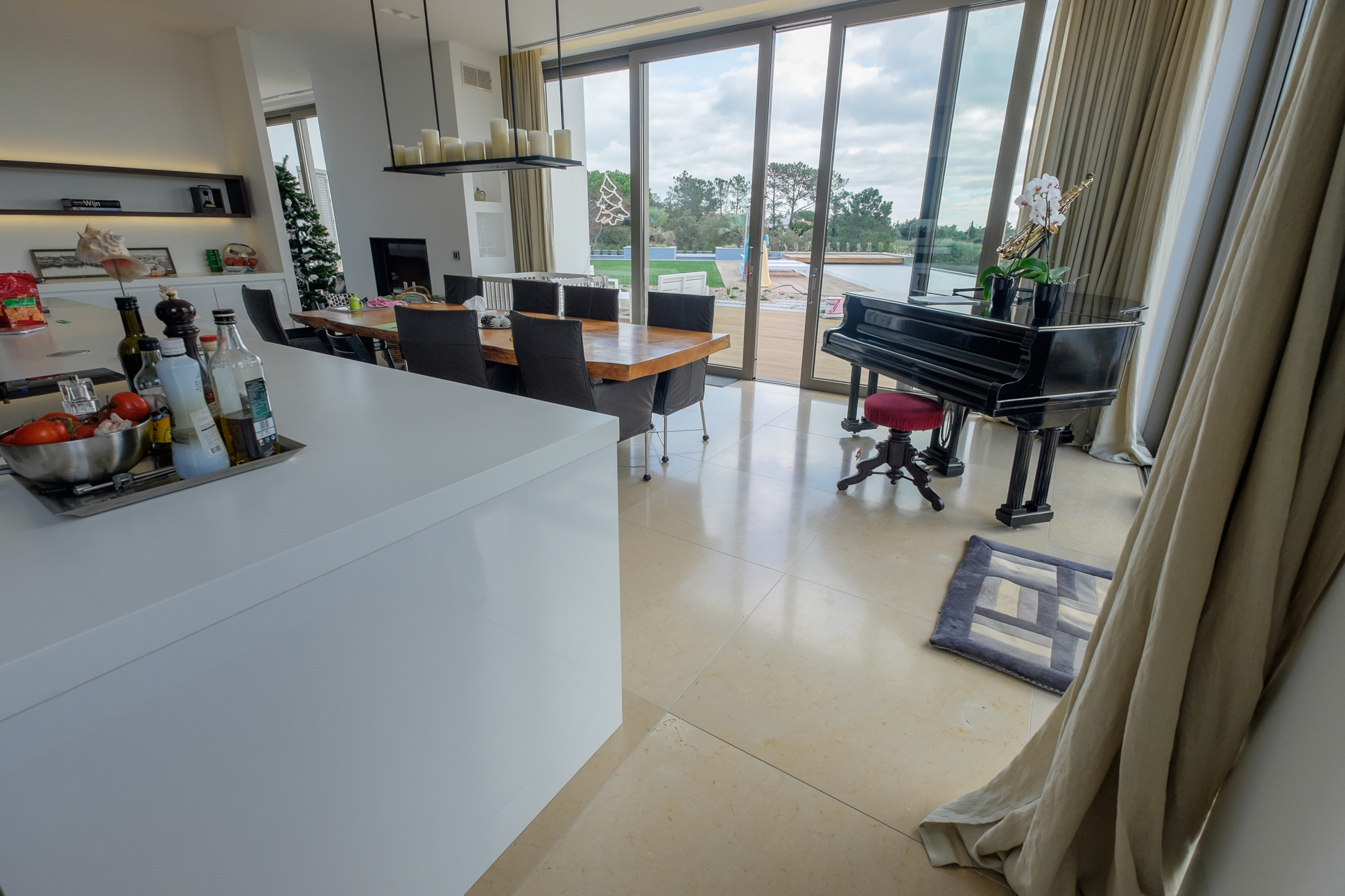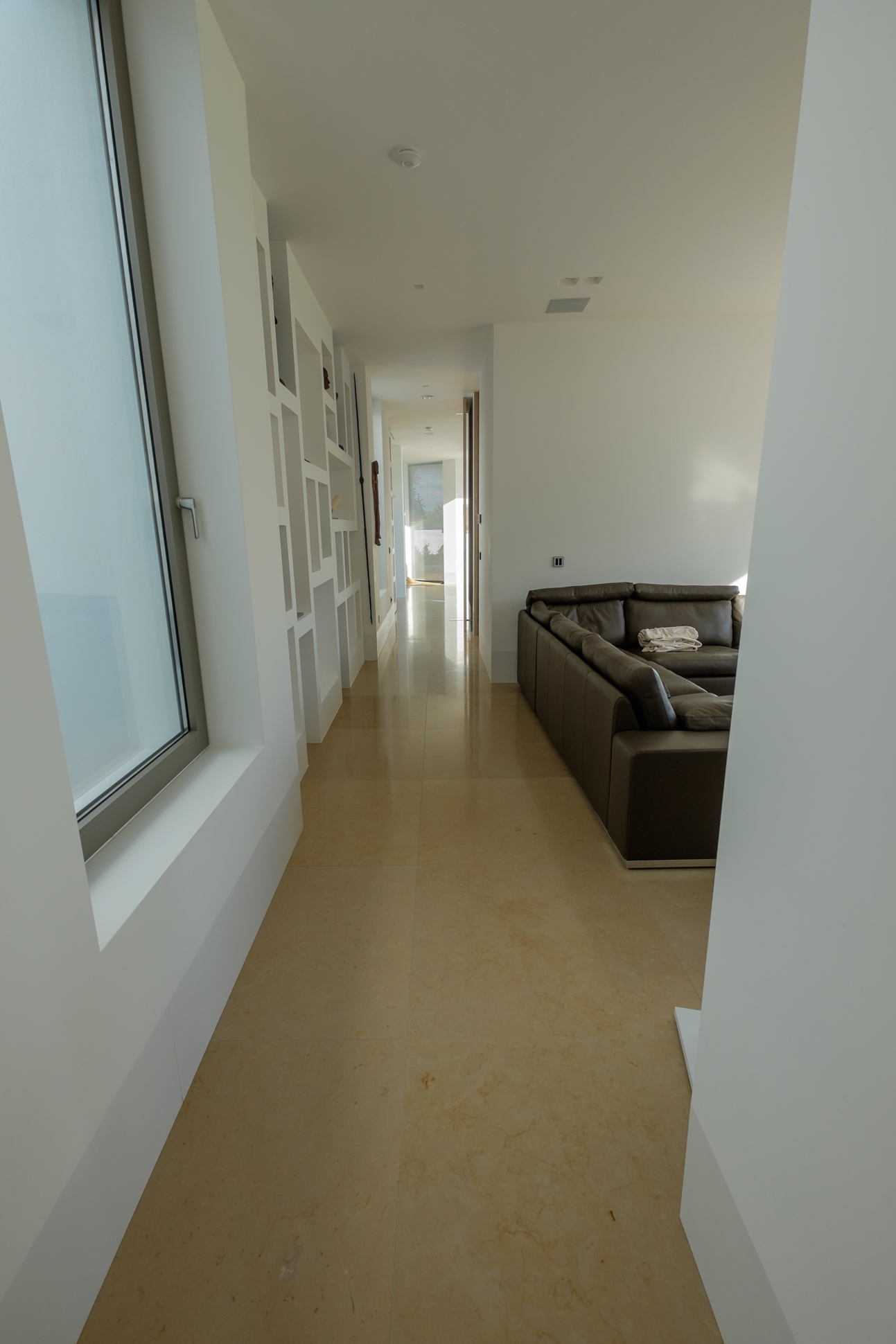 Ataija Coffee: um Ataija Crememais escuro, calcário de elevada rigidez. Pavimento com ladrilhos na medida 900x900x20mm acabamento Amaciado, obra no Algarve.
