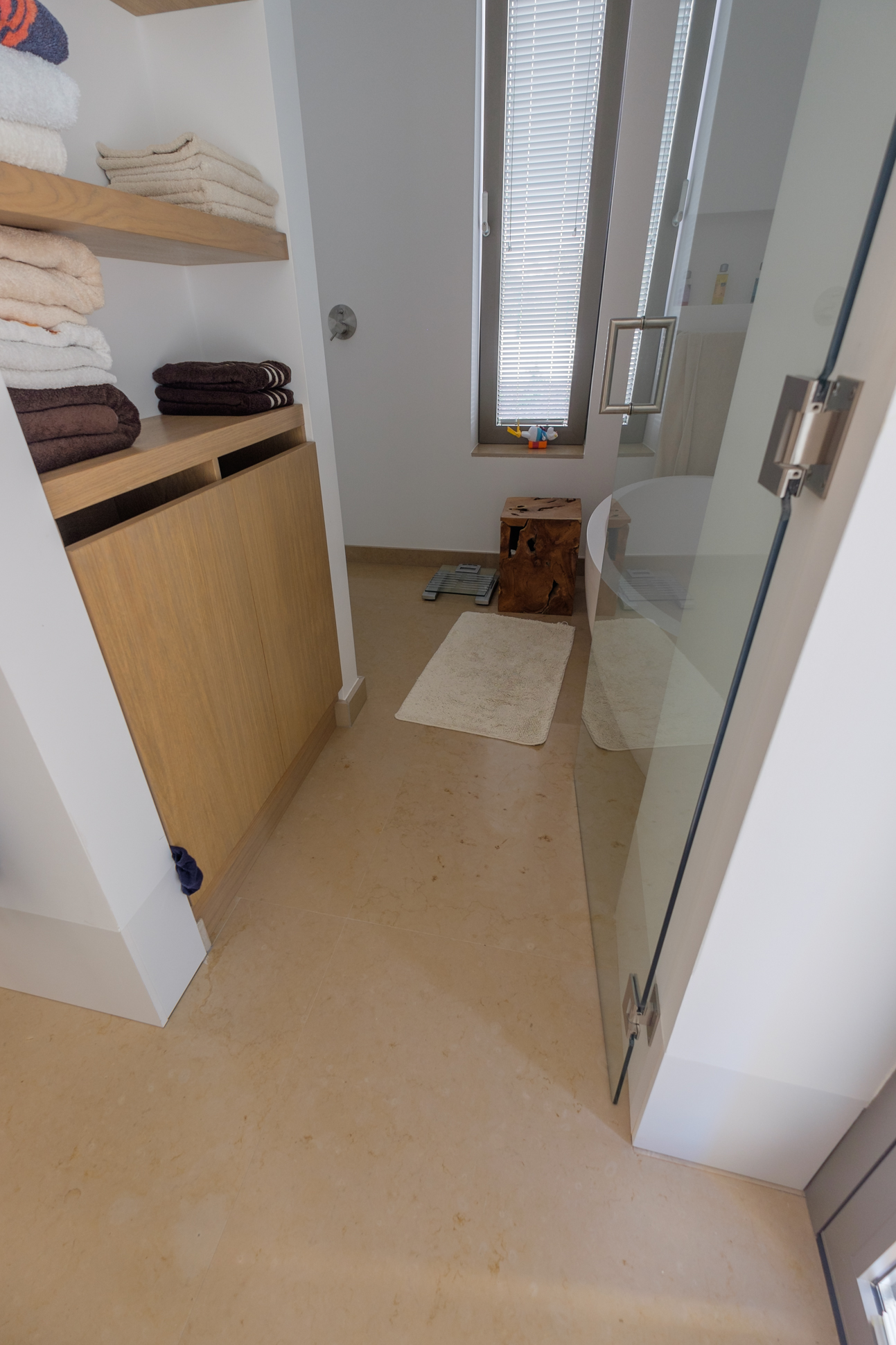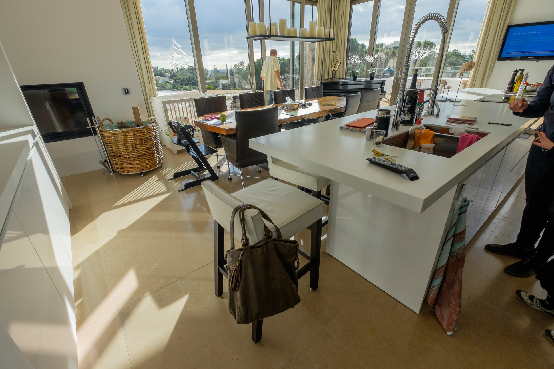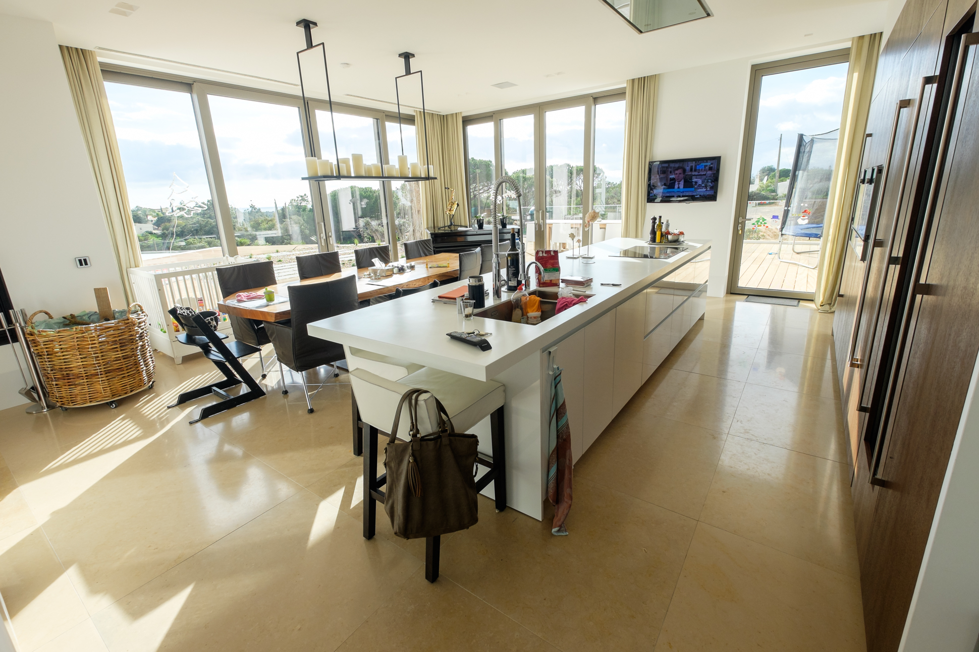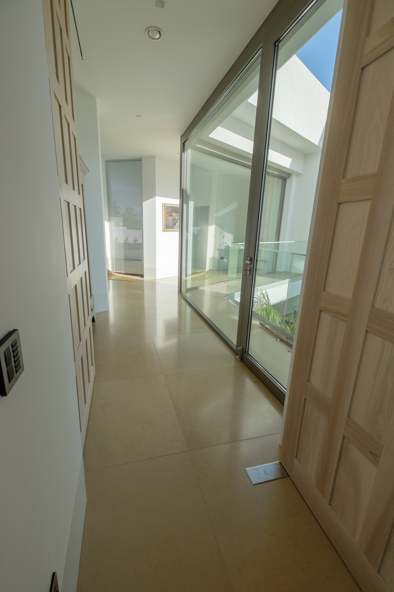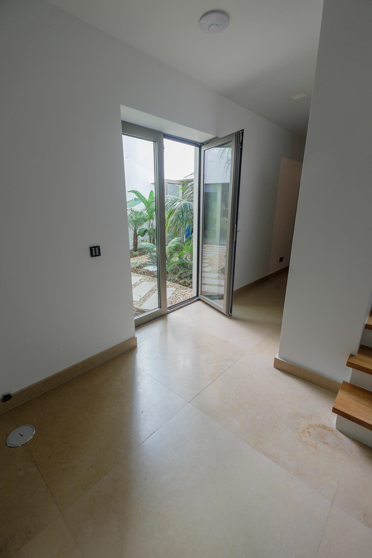 Ataija Coffee: um Ataija Crememais escuro, calcário de elevada rigidez. Pavimento com ladrilhos na medida 900x900x20mm acabamento Amaciado, obra no Algarve.