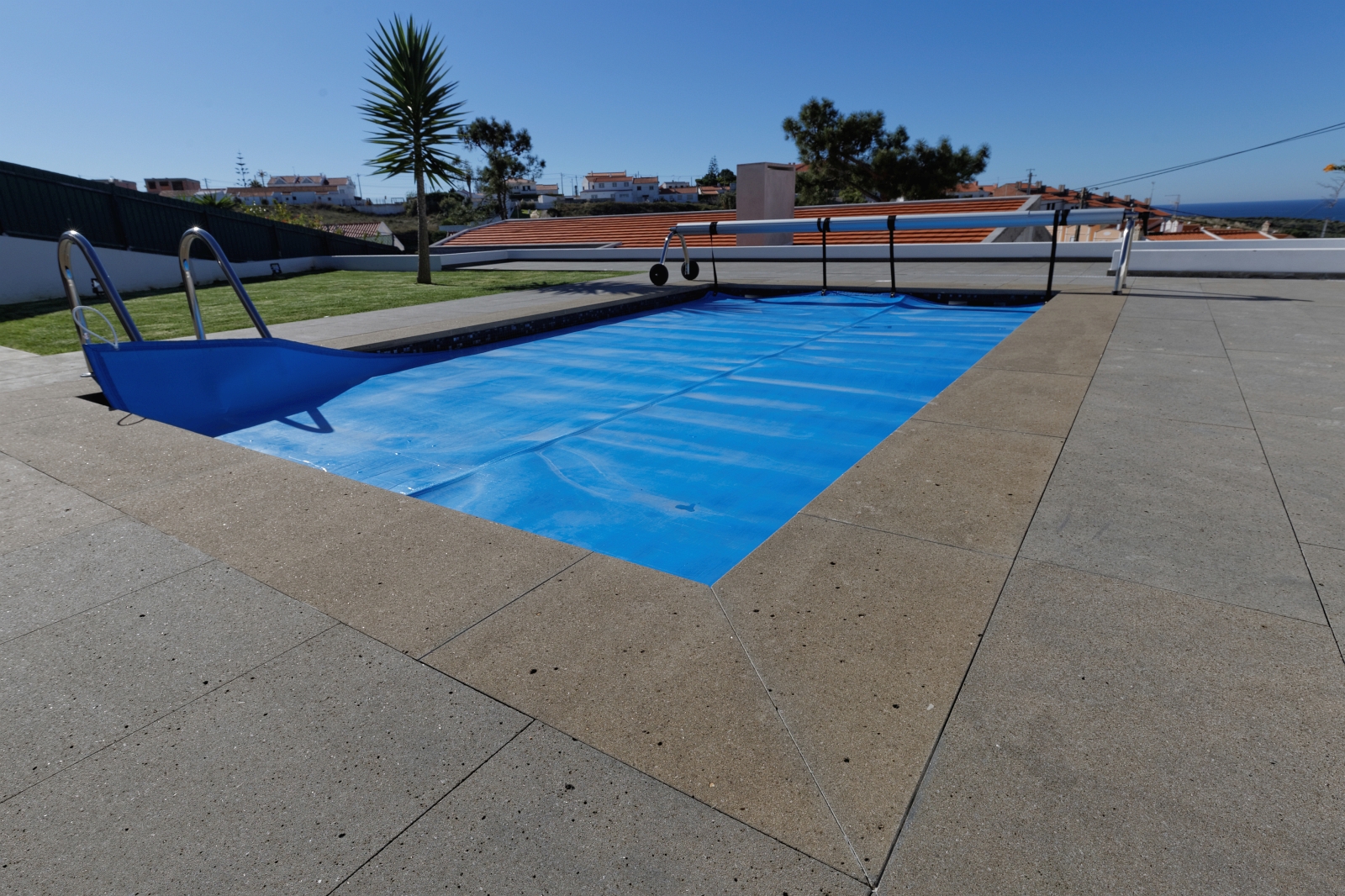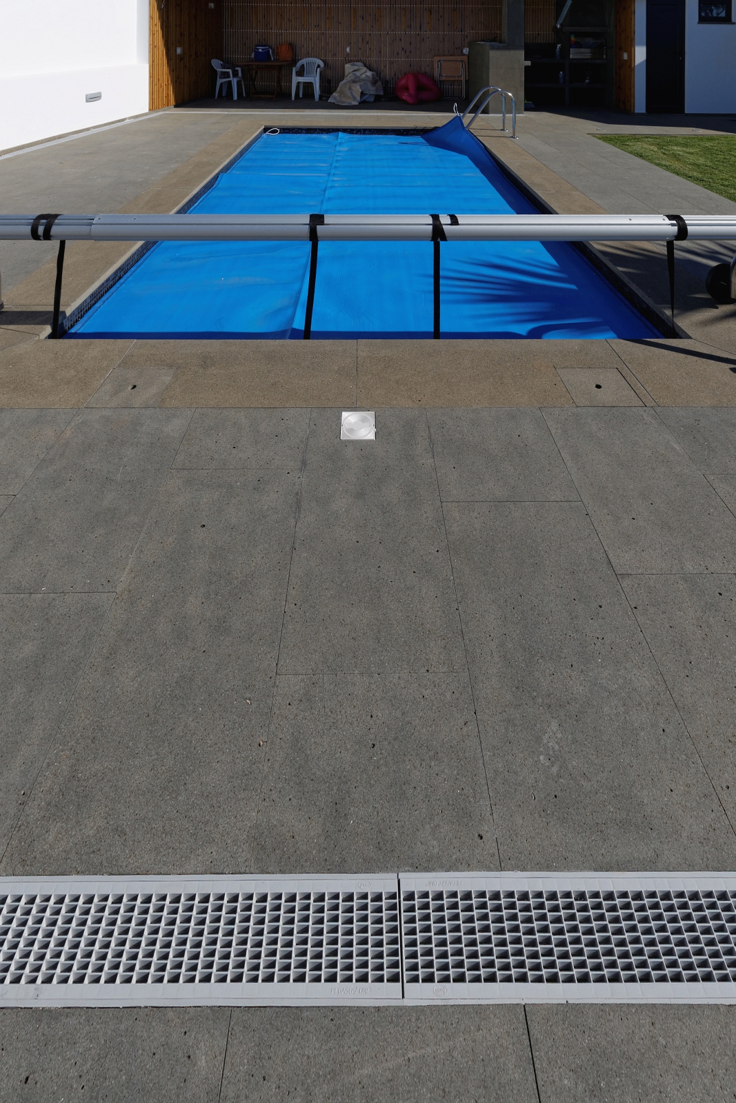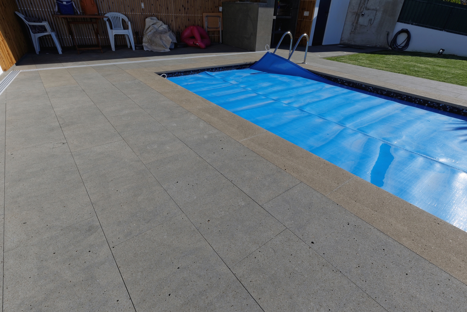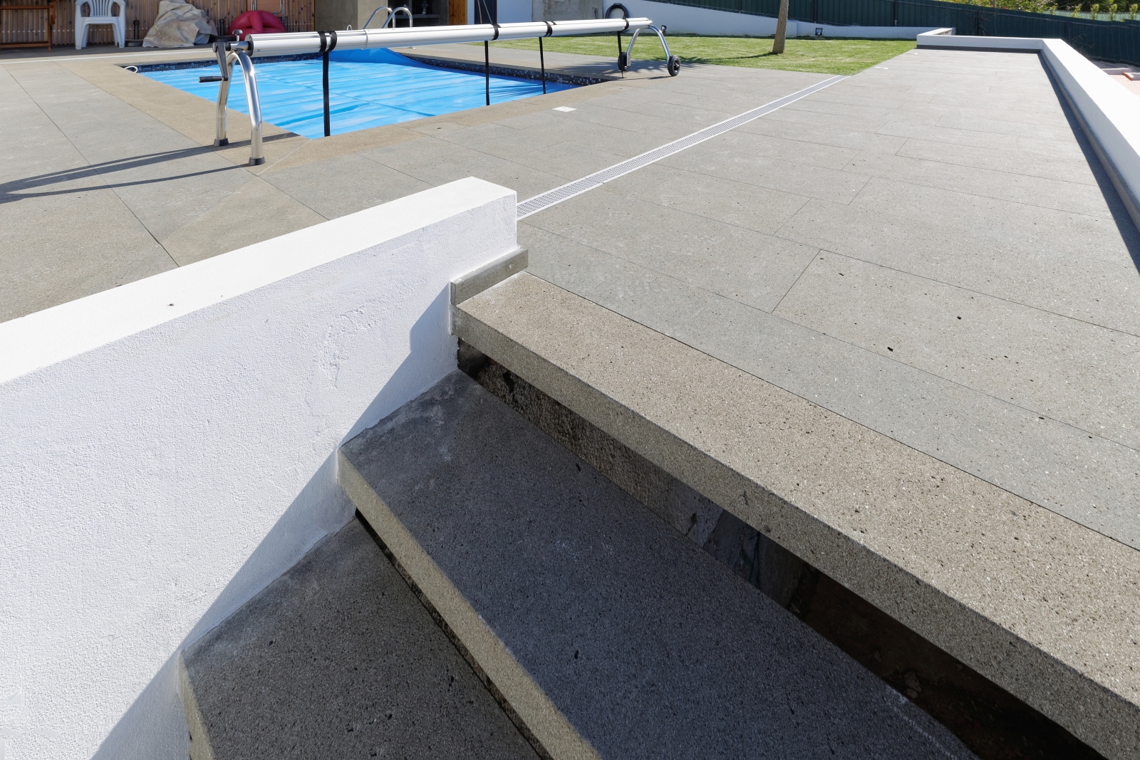 Para este projecto de áreas exteriores de piscina, foi escolhido basalto nacional para pavimento, escadarias, capeamento de piscina e churrasqueira no acabamento serrado e areado.