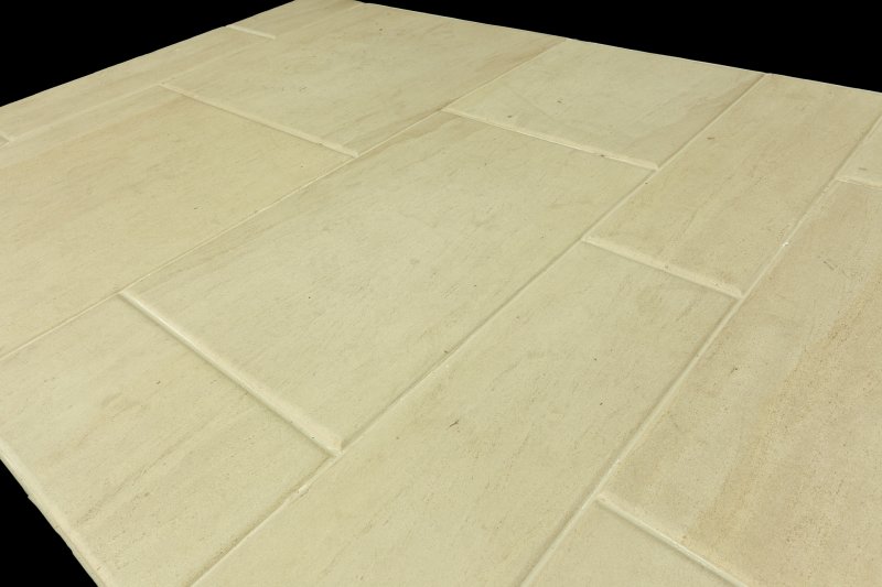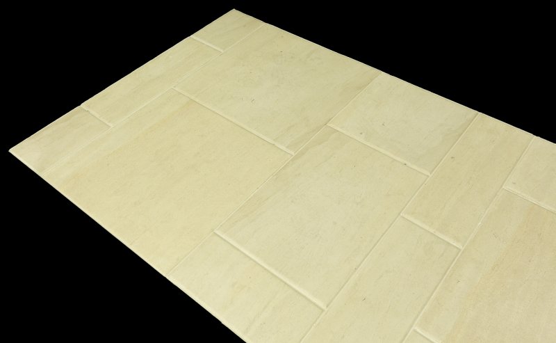 Calcário Relvinha (parecido com Moca Creme Grão Fino) acabamento Escovado e arestas Boleadas.