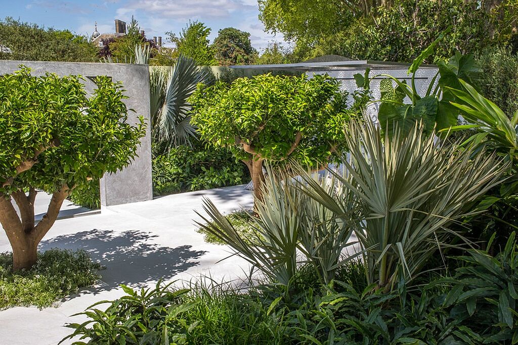 Design de Kamelia Bin Zaal, construção de The Outdoor Room; fotos e vídeo da RHS e Plurimármores.