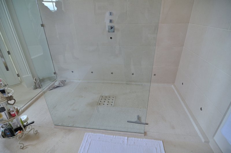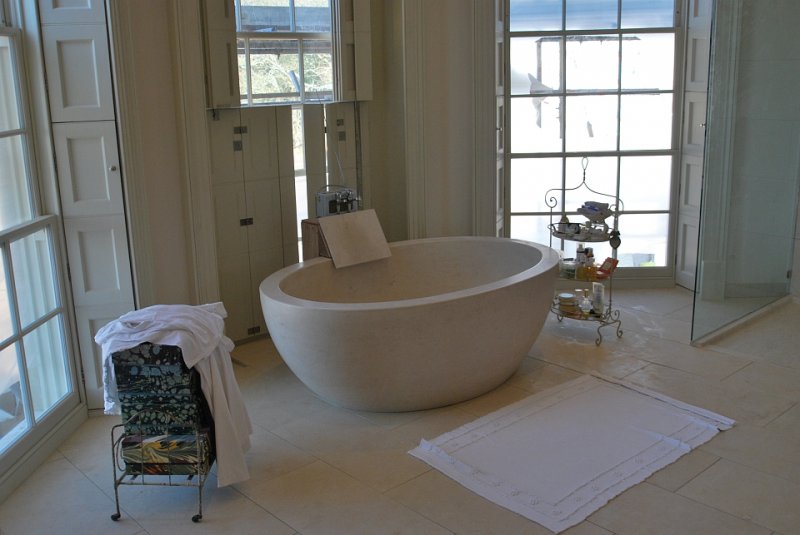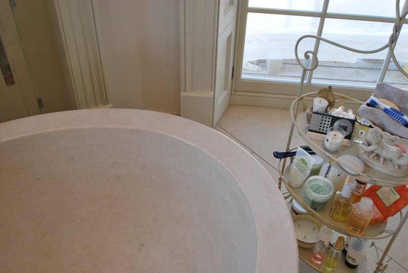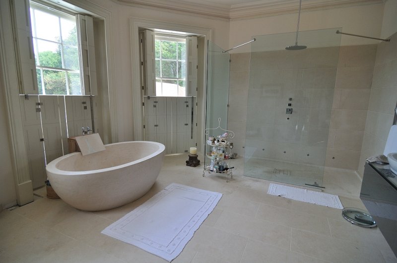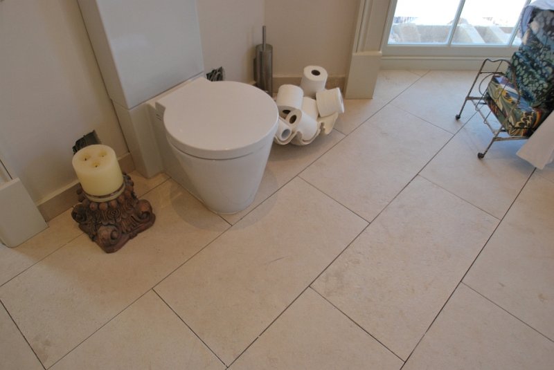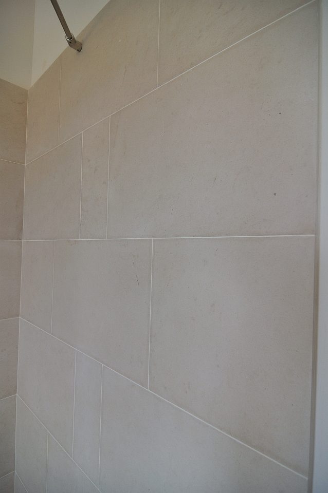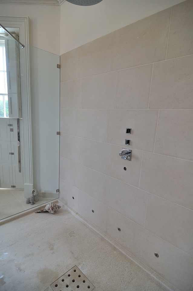 Projecto com Moleanos Limpo acabamento escovado no pavimento, Ladrilhos com 80×40 e nas paredes Moleanos Limpo em acabamento amaciado. Banheira maciça em Moleanos e Impermeabilizado com Lithofin stainstop.